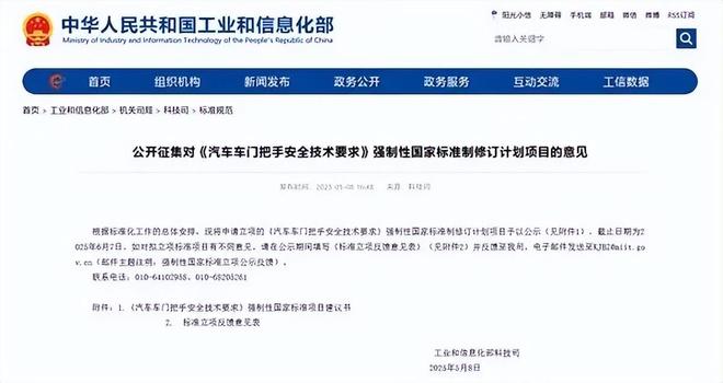 根据官网信息,5月8日工信部将申请立项的《汽车车门把手安全技术要求》强制性国家标准制修订计划项目予以公示。